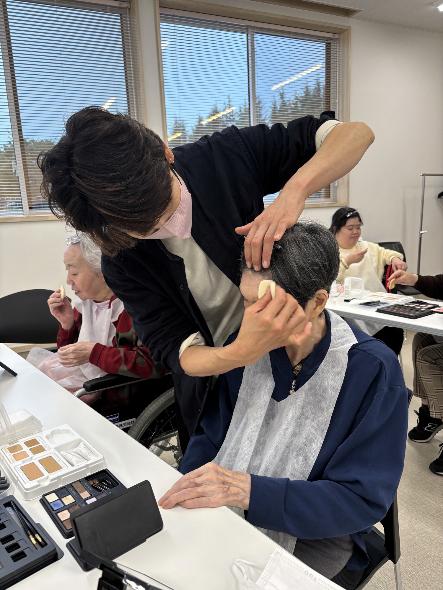 講師の皆様が、優しく丁寧にメイクの楽しさを教えてくださり、参加された皆さんは、パレットを目にワクワク!真剣なまなざしで、ファンデーションを塗ったり、アイシャドウの色を選んだり...。